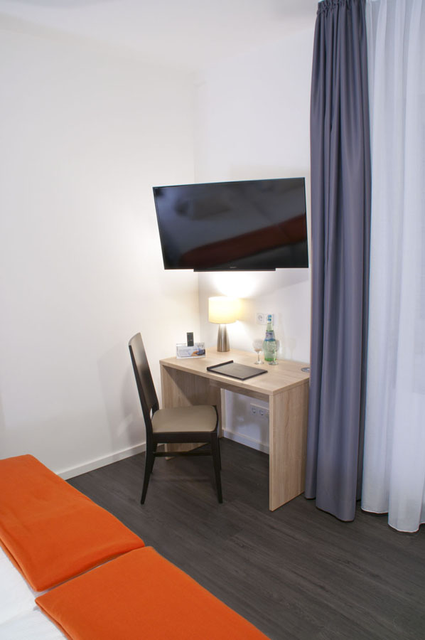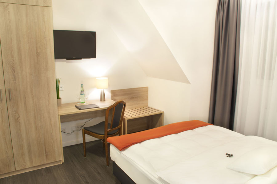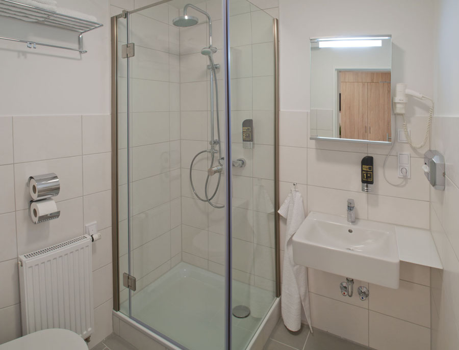 Kompakt und auf das Wesentliche reduziert. Die Einstiegskategorie unserer Zimmer verfügt über ein 1,00 m breites Bett und ein kompaktes Badezimmer mit Dusche. Konzipiert für den kurzen Aufenthalt.